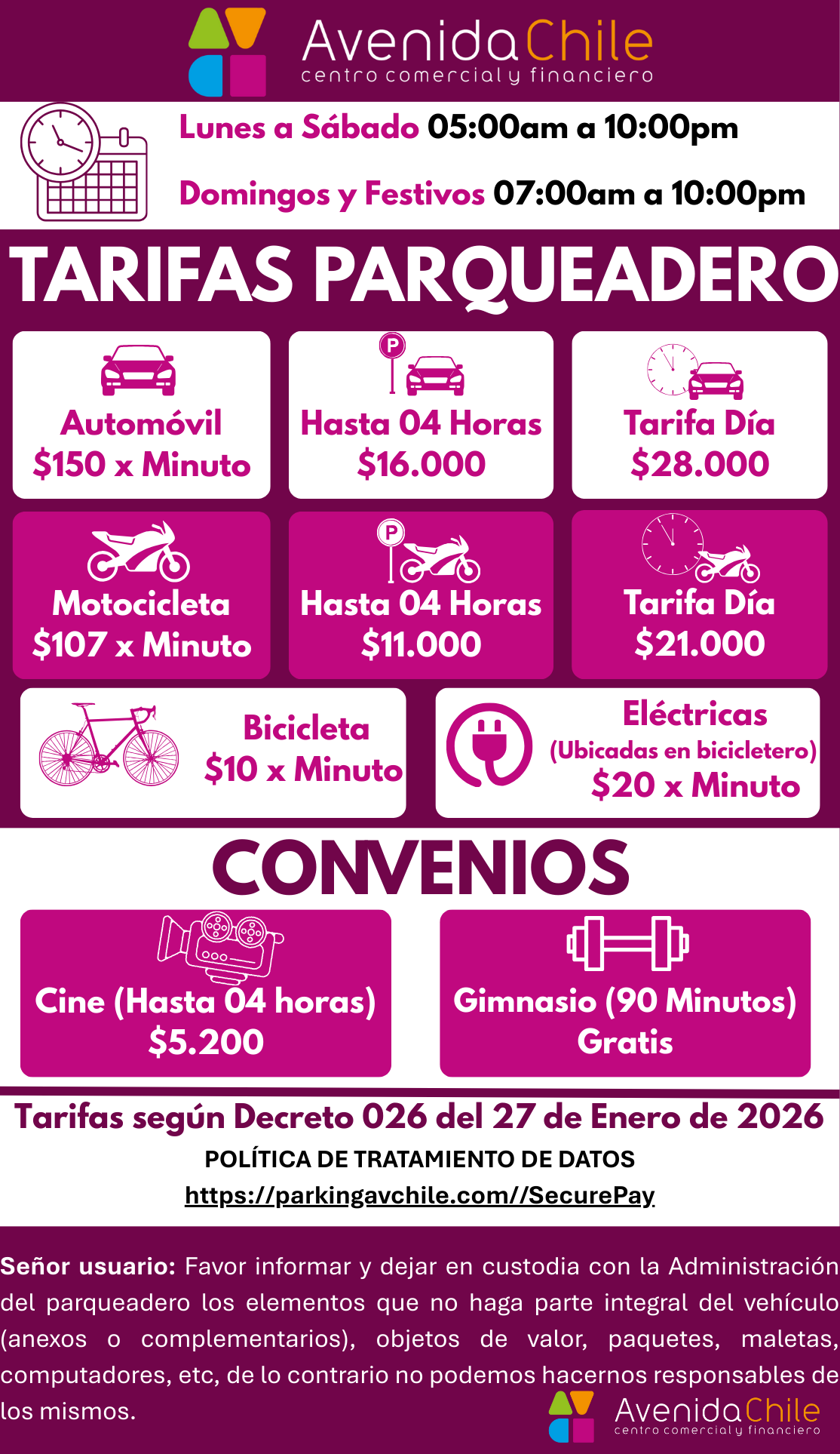 Minuto $150. Tarifa primeras 4 horas para vehículo $16.000. Tarifa día $28.000.